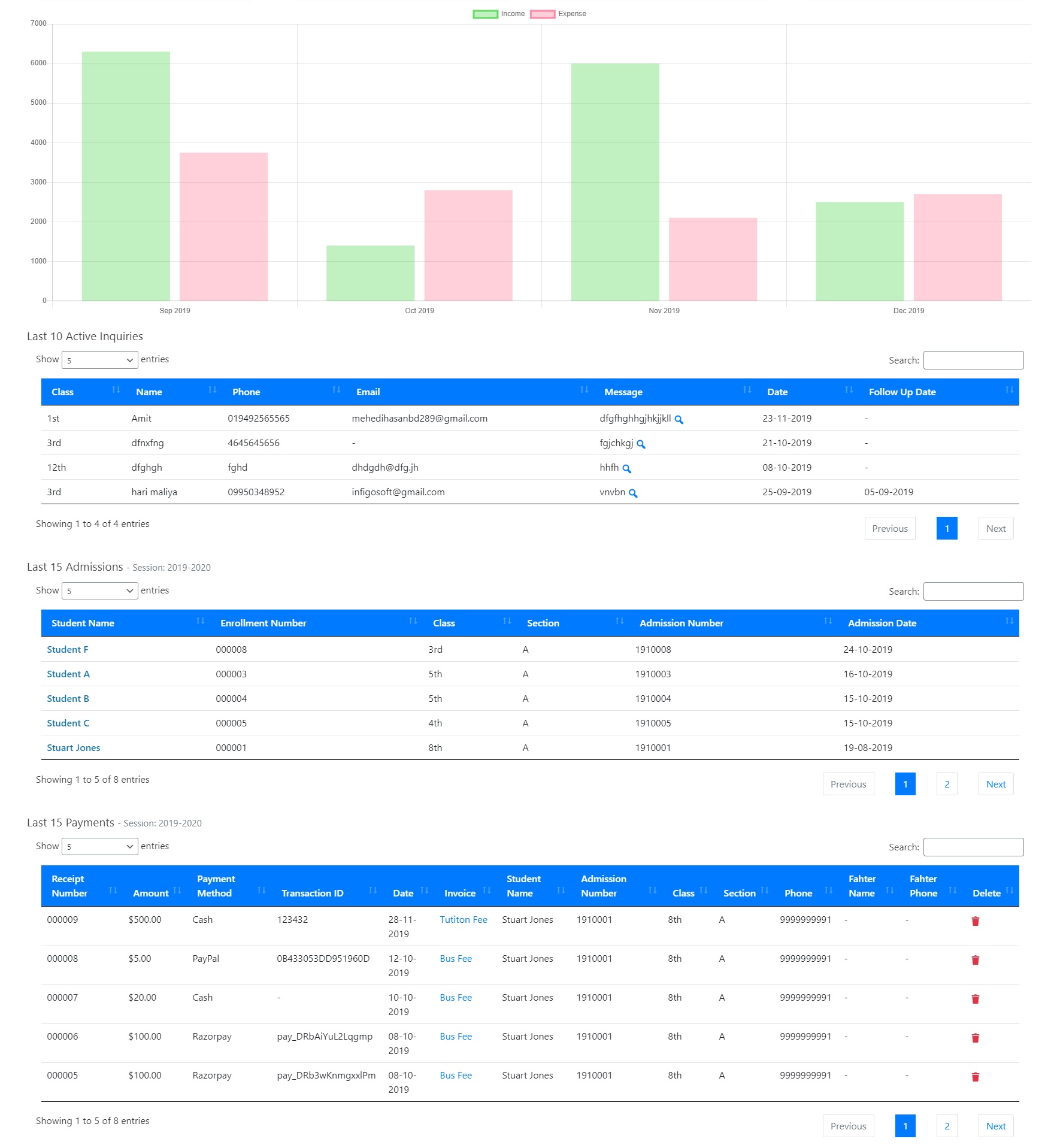 学生管理:具有必要权限的学校管理员和工作人员可以通过为其分配录取编号、班级、部门和卷号来新入学。此外,对于会话中的每个学生记录,都会自动生成一个新的注册号。