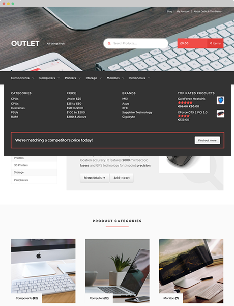 通过将所有列与网格对齐,每个Mega菜单都能无缝地融合到您的Storefront设计中。Mega Menus与所有Storefront子主题兼容 。