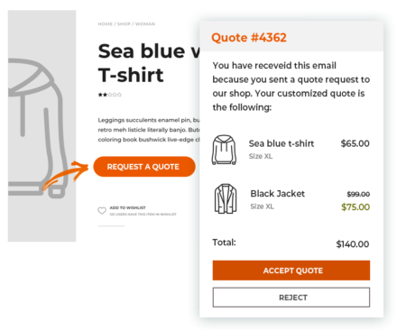 我们的插件允许在您的产品页面上显示“添加到报价”按钮或链接。客户可以将产品添加到列表中,填写表格,然后提交自定义报价请求。